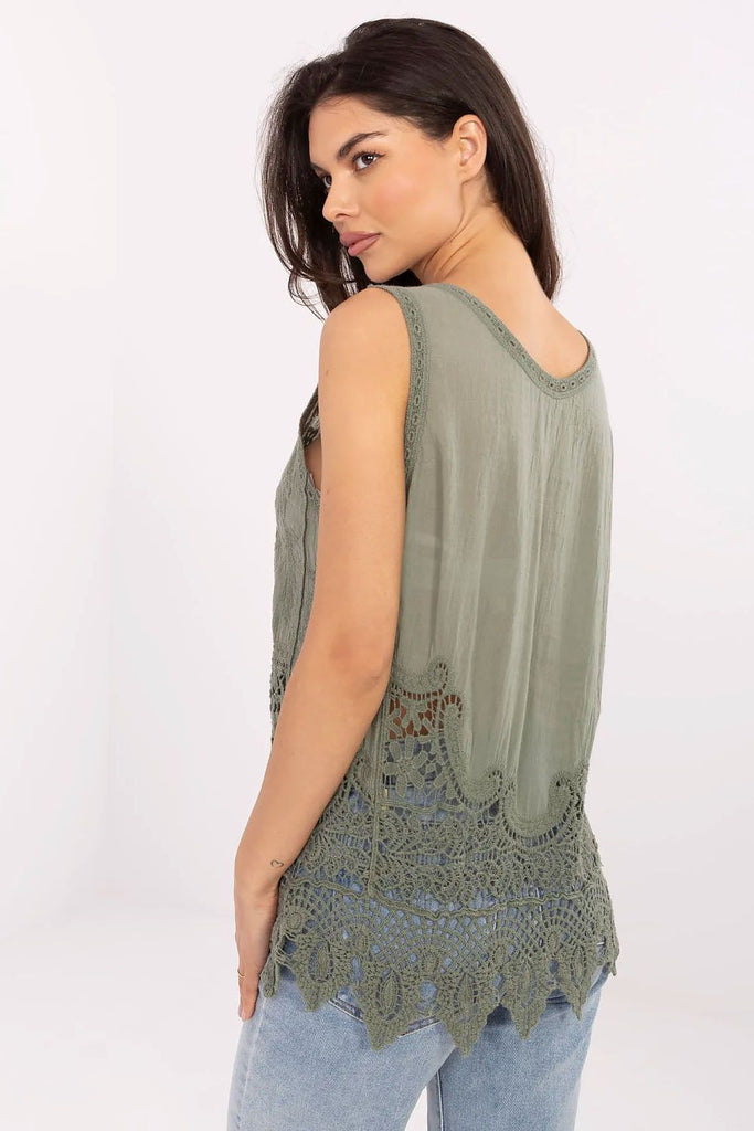 Delicate, feminine blouse in boho style, created with everyday comfort and subtle style in mind. Made of natural cotton, which provides breathability and comfort throughout the day. The blouse stands out with rich, decorative finishing, an openwork pattern combined with delicate embroidery and lace creates an elegant and light whole. Sleeveless model, of standard length and with a classic, round neckline, will work great on warmer days. The blouse has no fastening, which further emphasizes its casual, loose fit. It is an ideal choice for everyday wear with jeans, shorts, or boho-style skirts.