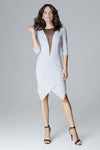 Dress with 3/4 length sleeves made of soft, viscose knitwear. The top is simple with a round neckline with a contrasting transparent insert. It is distinguished by a bottom with an asymmetrical cut-out at the front.