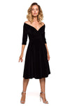 This dress has more than one face. A flared, layered midi length bottom and a top with an envelope neckline that can be worn in two ways, with the shoulders uncovered or a slightly more closed neckline. The dress is unlined and fastened with a concealed zip.