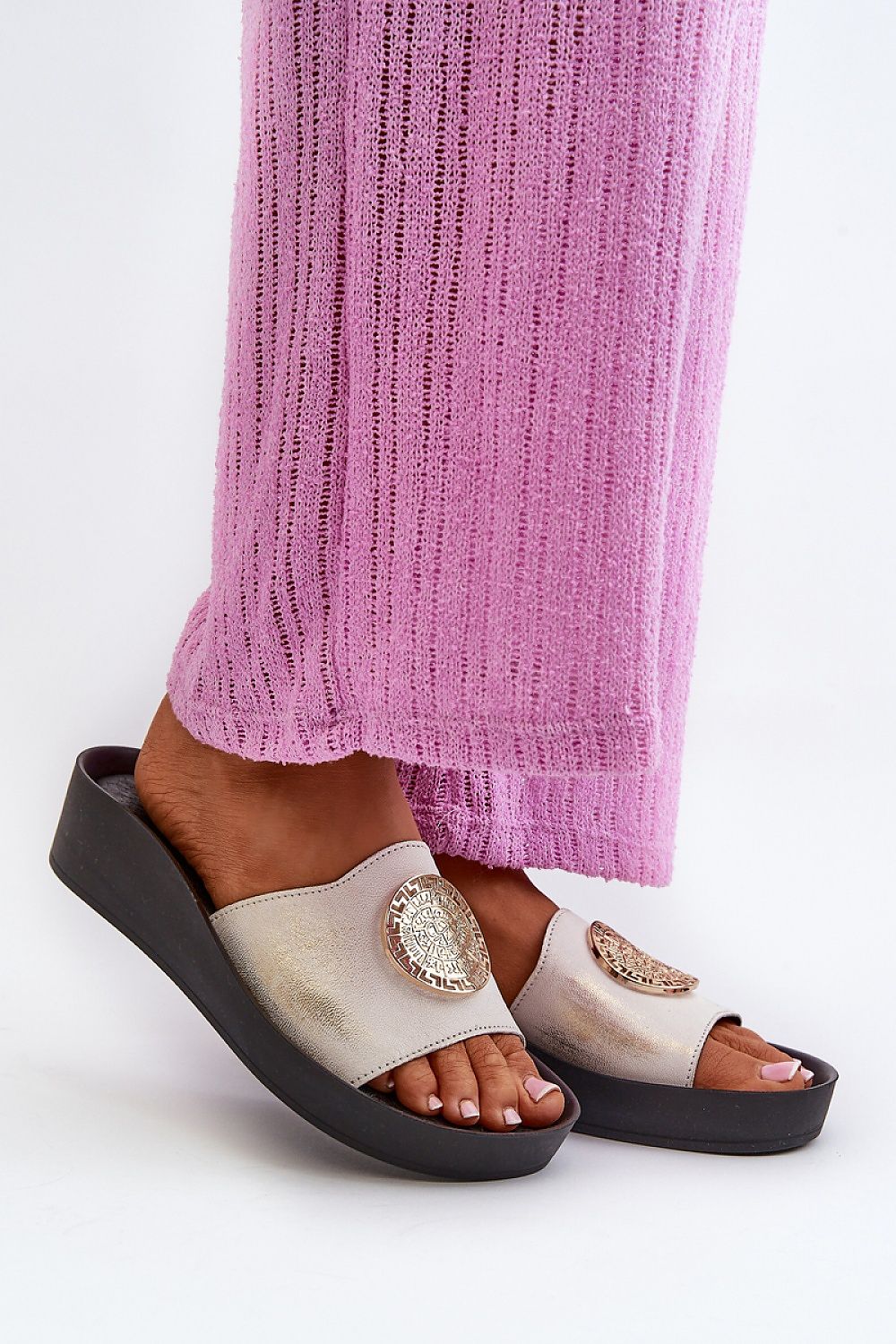 Elegant flip-flops made of high-quality natural leather are the perfect choice for women who appreciate style and comfort. Set on an anchor, they provide not only extra height, but also stability and support for the feet throughout the day. The soft insole adapts to the shape of the foot, providing exceptional wearing comfort. As an added bonus, the gold detailing is sure to catch the eye. These flip-flops are perfect for both casual and special occasions, complementing any styling from casual to more formal.