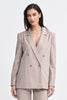 Oversized jacket made of material with subtle, contrasting tennis-style stripes. It has a collar with lapels and long sleeves with buttons at the bottom. Shoulder pads add definition and elegance to the silhouette. The jacket is hip-length, emphasizing its modern character. Double-breasted button closure at the front gives it a classic and timeless look. Finished with a lining for comfort and aesthetics.