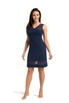 Striking and elegant women's shirt in dark blue. Made of high-quality viscose combined in a decorative way with a transparent mesh, decorating the shoulders while exposing them. The neckline resembles the letter V. The striking mesh is edged with a thin viscose trim. The back subtly exposes the back. The shirt is gently waisted, has a letter A shape, which allows you to mask the shortcomings of the figure. Its length reaches to the knees. The bottom is decorated with the same mesh, which is trimmed with a wide trim. It is comfortable, airy, lightweight and functional in use. Elegant, feminine, addressed to every woman, regardless of age. Recommended for summer evenings and nights.