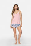 The romantic Babella Primavera women's set is distinguished by the matching combination of apricot pink on the top and the expressive floral motif on the shorts. Discreet lace on the neckline adds charm, and adjustable shoulder straps allow the blouse to fit any figure.