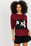 A sweatshirt set consisting of a sweatshirt and a skirt. Blouse with 3/4 sleeves and round neckline. Decorative print on the front. Skirt with higher waist, zipper and button closure.