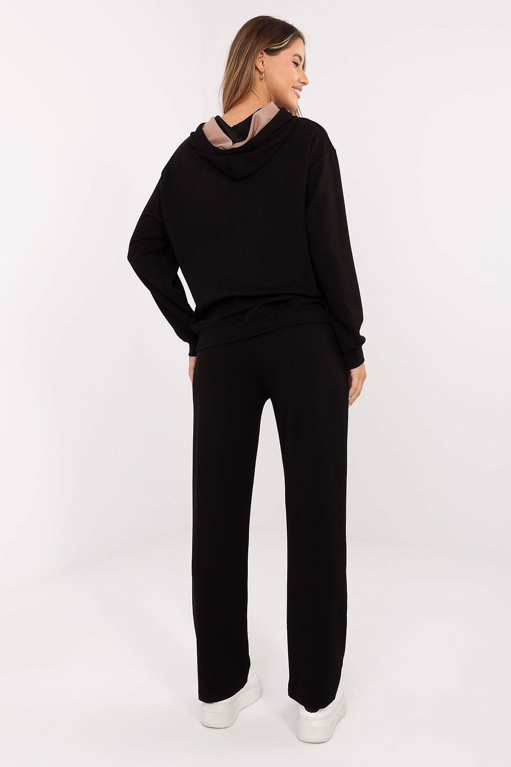 Women's tracksuit set consisting of a hoodie and pants in a casual style, perfect for everyday occasions. Made of exceptionally soft buttery material that is gentle and pleasant to the touch, with a predominance of viscose and a touch of elastane for greater comfort. The hoodie is of standard length with long sleeves, a hood, and a practical kangaroo pocket, adorned with subtle embroidery. The pants have a high waist, straight legs, and side pockets, also decorated with a small embroidery at the waist. Smooth material and minimalist design make the set combine comfort with modern style.