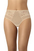 Tri-pack of high-waisted women's panties in beige color. The natural color of the panties can be freely worn under white dresses and skirts, as the beige color blends with the skin tone and is invisible. The multi-pack of panties ranges from a small XS size for petite ladies, to a larger one for round-shaped XXXL ladies. The sets are very popular among buyers because the price is much lower. The panties in the tri-pack have a high waist and reach to the navel, thanks to such height they cover and level out women's curves and expose the advantages of the silhouette. They are made of high quality transparent and airy, and delicate to the touch and for the female body fine mesh, which perfectly fits the buttocks exposing the bottom. On the front of the panties set is decorated with a striking lace with a dense floral motif. In the waistband from the inside is sewn in a thin elastic band that does not stand out, the same elastic band the panties are finished aesthetically around the thighs and on the buttocks. In the area of the crotch on the inside of the panties are lined with delicate airy cotton, which allows you to maintain freshness and comfort while wearing. Such a set of high-waisted panties is a necessary must have for any modern woman who loves comfort, convenience and good looks.