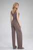 Sleeveless summer jumpsuit with a sweetheart neckline at the front and back. Wide legs, tied at the waist with a fabric belt.