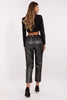 Women's trousers made of shiny material that combine elegance with everyday comfort. Made of high-quality blend of viscose, cotton, and elastane, they provide comfort and perfect fit to the silhouette. The smooth material with a subtle shine gives them an elegant character, while the high waist and tapered legs beautifully emphasize the body shape. The trousers are equipped with practical side pockets and an elastic tie at the waist, allowing for individual adjustment to the silhouette. Perfect for both work and everyday outings, they pair well with elegant blouses, shirts, and casual tops.