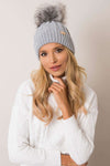 Women's winter beanie with turn-up, decorative plaid weave and pom-pom.