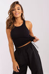Short T-shirt with thicker straps and a round neckline. The shirt is made of ribbed material.