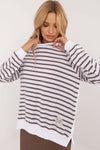 Everyday striped blouse, perfect for everyday wear and for work, made of soft material with a predominance of micro modal and the addition of elastane, which provides comfort and a gentle fit to the figure. The casual style is highlighted by long sleeves and a classic round neckline. The blouse has a standard length, and there is a subtle slit on the sides, which adds lightness and freedom of movement. At the bottom there is a small patch, which is a stylish detail. It is a comfortable and versatile choice for everyday styling.