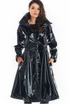 Knee-length vinyl coat with high collar and straight sleeves. Widened at the bottom, with a drawstring at the waist, fastened with buttons. Can be used as a raincoat. Available in two colours: black and red.