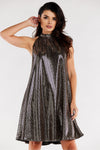 Loose, flared dress with decorative ruffle neckline, on a stand-up collar buttoned at the back. The dress is sewn on an elastic lining. The dress was manufactured in Poland.