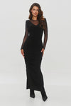 The extraordinary black dress that exudes elegance and sophistication. The model has a fitted cut that emphasizes the figure. Ruching on the sides adds texture and accentuates the waist and hips, while masking imperfections of the silhouette. The dress has long, sheer mesh sleeves that create a subtle contrast with the opaque bodice of the dress, contributing to its elegant and modern look. The neckline is a combination of sheer fabric and a V-shaped neckline, adding a sensual character to the design. Additionally, there are striking shoulder pads that emphasize the shoulder line. An elegant addition is the gold button placed at the back of the dress, which makes it easy to put on the outfit. The dress reaches the ankles and has a flirtatious slit, allowing freedom of movement and adding a touch of finesse. The model is perfect for formal occasions or evening outings, balancing sophistication with a hint of boldness.