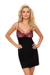 An alluring and sophisticated Candy II chemise. Thin, adjustable straps lead to a bra of black mesh. Embroidered, two-toned ornaments create an extraordinary setting for feminine curves. Additional stripes of fabric coming down between the breasts spice up the creation with a hint of pepper. Under the bust a cut-off and crease. Smooth fabric in the lower part outlines the waist, reaching to mid-thigh. Made in Poland.