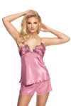 Elegant satin two-piece set Dusty Rose in unusual powder pink colour. Decorated with a stylish mosaic pattern on the cups, the shape of which allows to emphasize the neckline. The blouse is neatly cut, with thin, adjustable straps. Shorts simple, without decoration, highly comfortable.