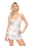 Elegant set with a pattern of delicate leaves made of satin. Shirt on thin, adjustable straps. Cut-off cups slightly creased. Shorts on elastic band. The set is packed in tissue paper and a box.