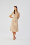 Created with attention to detail, the dress is a unique piece of clothing, designed and sewn in Poland, which emphasizes high quality workmanship and local character. Decorative pleats on the sides of the dress add a unique character to the whole, giving it a distinctive and original look. The teardrop neckline adds subtlety to the dress, highlighting the gently exposed chest. The cut-off at the waist brings elegance to the styling, emphasizing feminine curves. Short rolled sleeves add lightness to the dress and give it a casual feel. The A-shaped bottom makes the dress comfortable, while giving the feminine silhouette a delicate, subtle shape. The below-the-knee length makes the dress suitable for both more formal occasions and everyday wear. A covered zipper at the back makes it easy to put on and take off the dress, while maintaining its elegant look. The lack of lining makes the fabric fit pleasantly on the body, remaining light and comfortable to wear. This dress is not only distinguished by its original design, but is also a proud representative of Polish tailoring craftsmanship and design.