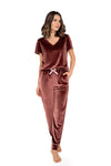 Mega trendy velour tracksuit in a beautiful burgundy colour. Ideal as homewear, high quality, very feminine. The fabric of medium thickness, also works well between seasons, it is very comfortable and elastic. Top with short sleeves and a pointed neckline. The trousers are long, loose, finished with welts at the ankles. Soft elastic band and a bow at the waist. Pockets on the sides.