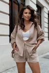The muslin women's set is an elegant and comfortable option for warm days, combining a classic cut with modern ease. Made of lightweight and breathable muslin, it provides comfort throughout the day. The set includes a button-up shirt with a classic collar and long, wide sleeves, which add a subtle elegance to the whole look. The high-waisted shorts have a tie at the waist, which beautifully accentuates the silhouette, and the side pockets add practicality and a stylish finish. The uniform color of the material makes the set incredibly versatile and easy to style, suitable for various occasions, from casual meetings to vacation trips.