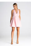 Elegant backless foam dress, fitted at the neck. It has an asymmetrical buttoned front and a counter-fold skirt.