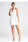Elegant backless foam dress, fitted at the neck. It has an asymmetrical buttoned front and a counter-fold skirt.