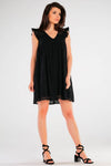 Dress is made of openwork fabric with a smooth lining that guarantees comfort and convenience in use. Slightly flared from the bust line, decorated with frills on the shoulders. Perfect as a styling for a family party or a night out with friends, it all depends on the choice of accessories. The product was designed and produced in Poland.
