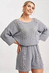 Two-piece set consisting of a blouse and shorts. The blouse is adorned with knit inserts at the front. The blouse features 3/4 sleeves and a round neckline. The shorts have lace inserts.