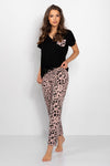 Ladies' pyjamas consisting of a blouse and pants. Blouse with short sleeves, loose cut. Long pants with a print, without pockets, with a decorative bow at the waist. Also ideal as homewear.