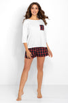 Women's pajamas consisting of a blouse and shorts. Blouse with 3/4 sleeves, and decorative pocket. Shorts with colorful checkered pattern, elastic waistband...