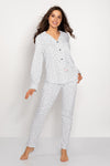 Women's pajamas made of pleasant to the touch, soft fabric. The fabric is of the right weight thanks to which it fits wonderfully, creases less and the cut retains its shape without problems. The top is buttoned, finished with a collar. Long pants with elastic waistband. It will be perfect for breastfeeding.