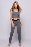Grey two-piece set with striking black rubber bands. Ideal as sexy homewear or pyjamas. A blouse in a form of a short, fashionable top with interesting, wider shoulder straps. Long, comfortable trousers with visible elastic waistband covered with a print just like the shoulder straps. Decorative buttons on the front. The latest Sensis collection.