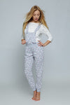 A charming and incredibly comfortable set consisting of a plain cotton blouse and dungarees, covered with a print of white and pink owls. The proposal is ideal as homewear. Long pants, finished with welts, in a cool shade of blue. Legs with welts.