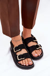 Sandals made of eco suede combine comfort with modern style. Thanks to the platform, they provide comfort and lightness when walking. The velcro closure allows for a perfect fit to the foot. This model is characterized by gold buckles, which add a unique charm to it. It is the perfect choice for summer days!