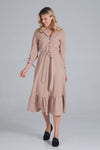 Maxi dress cut off at waist with elastic band. The bottom of the dress is flared with a ruffle, V neckline with lapels, buttoned halfway. Sleeve 7/8 tied with a sash, zipped at the side.