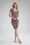 Fitted summer midi dress with short sleeves. Cheese neckline at the front and back, vertical elastic band sewn into the fabric along the entire length of the front and back.