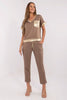 Elegant and comfortable women's set is a perfect choice for both everyday wear and work. It consists of a short-sleeved blouse with a v-neck and high-waisted trousers, which provide comfort and a stylish look. The model is distinguished by golden accents on the breast pocket, cuffs, and belt, which add subtle elegance to the whole outfit. The tie at the waist allows for a perfect fit to the silhouette, and the side slip pockets increase functionality. Made of a pleasant to the touch blend of viscose, cotton, and elastane, the set fits nicely on the body and ensures comfort throughout the day. The smooth pattern and straight legs make the set versatile and perfectly complement various accessories.